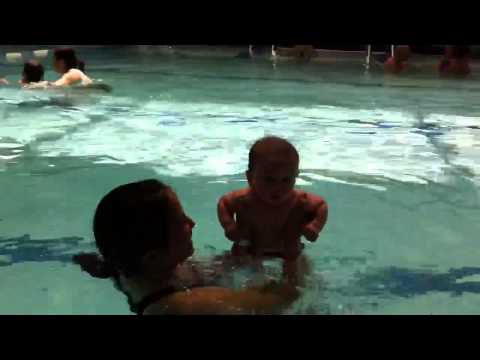 Today we went swimming for the first time! Open swim hour in what was essentially a huge bath tub, i.e. water was warm! Rosa seemed to really love it and started kicking right away. We even dunked her head underwater which she seemed more or less fine with (only had a sourpuss face for a few seconds). She even made friends with the lifeguard. Showing off, I guess. One friends joked that she must have a thing for people in uniform, though I refuse to entertain any such idea! Daddy was sad to miss her first debut in the water so we had a friend film for us. It's a little hard to see but at one point she flashes a smile. Takes after Ba Ngoai, OngBa Co, and her cousins who love the water!